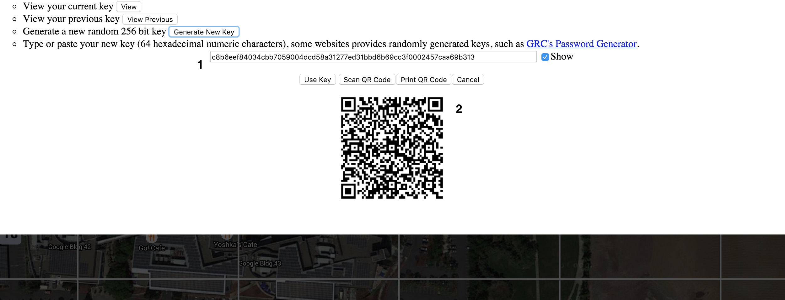 - QR Code representation (2) of the key or the geographical password displayed in the text box.